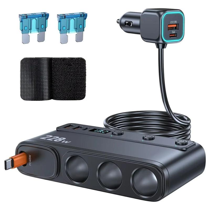 228W Chargeur de voiture 9-en-1 avec chargeur allume-cigare rapide avec interrupteurs indépendants et affichage LED - 3x QC3.0 USB-A, 2x PD USB-C, câble PD USB-C, 3x prise allume-cigare