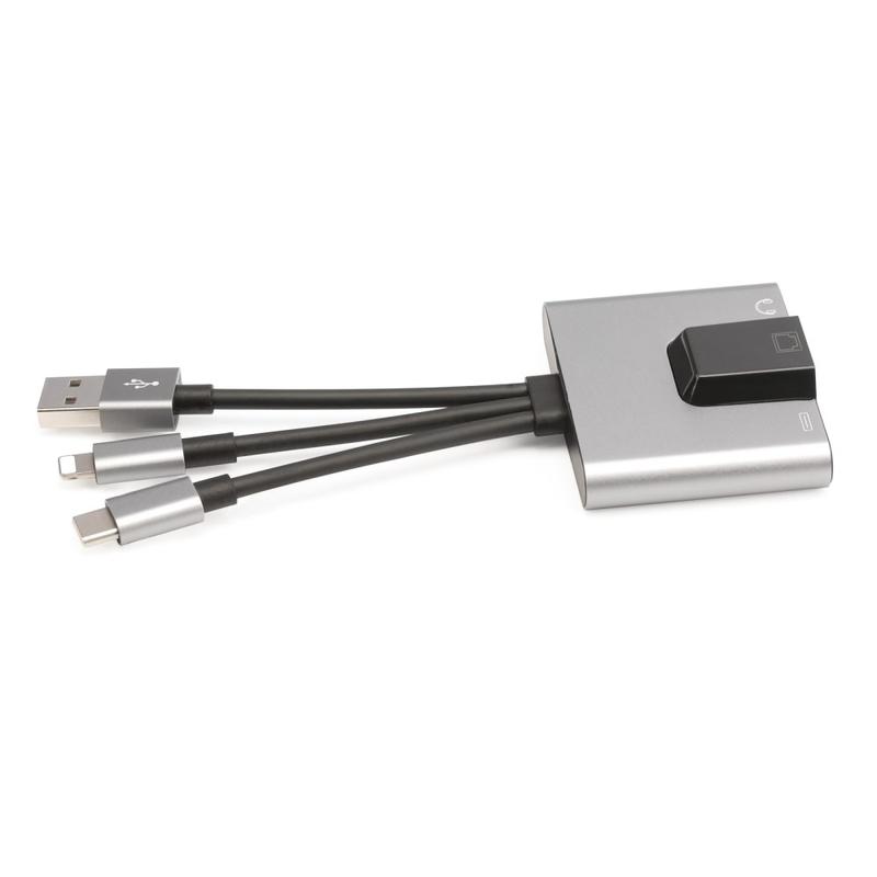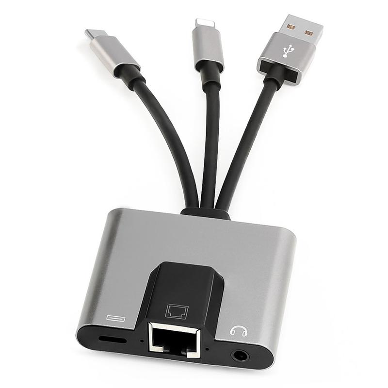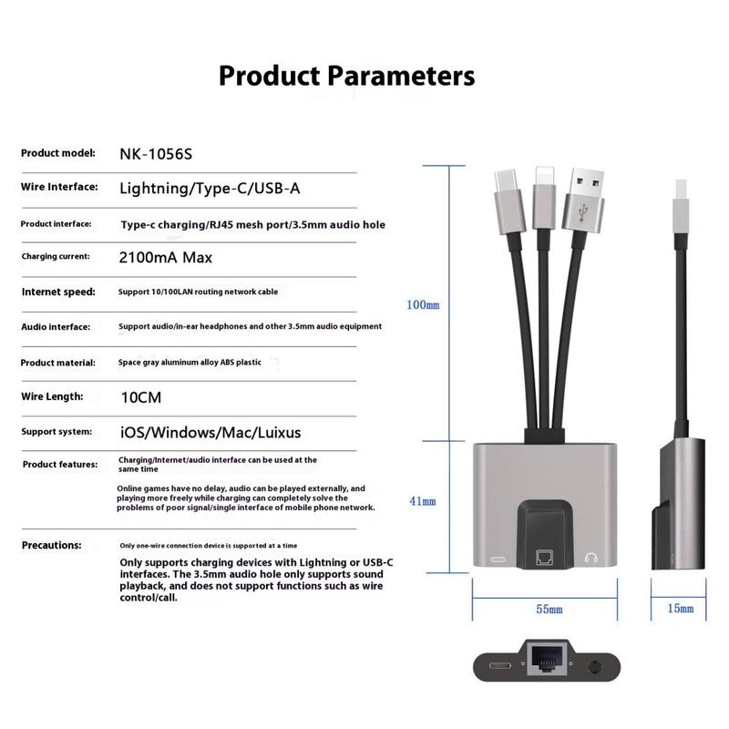Adaptateur Ethernet 3-en-1 NK-1056S - USB-C, USB-A et Lightning, prise audio 3,5 mm et support de charge USB-C pour Windows, Mac, iPhone et iPad - 10cm