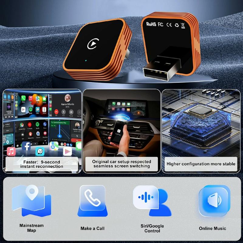 Alimenté par une puce Allwinner V821 avec mémoire DDR3, cet adaptateur est conçu pour offrir des performances efficaces et une reconnexion rapide. Selon les spécifications fournies, il prend en charge une reconnexion instantanée en 9 secondes et une reconnexion automatique d'environ 15 secondes au démarrage du véhicule, ce qui contribue à réduire le temps d'attente avant utilisation. Sa taille portable, sa large plage de températures et sa configuration plug-and-play en font un choix pratique pour les conducteurs qui souhaitent une expérience smartphone en voiture plus simple et plus ordonnée.