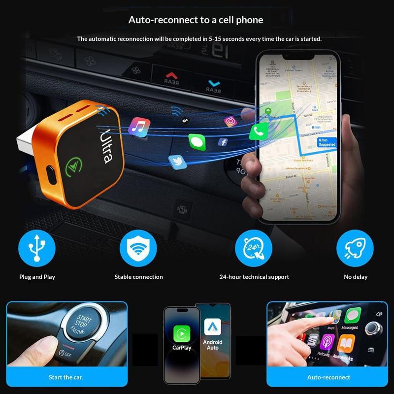 Simplifiez la connexion de votre téléphone dans votre voiture grâce à l'adaptateur sans fil 2-en-1 Ultra K15 pour CarPlay et Android Auto. Ce petit adaptateur USB est conçu pour transformer une connexion filaire compatible CarPlay ou Android Auto en une connexion sans fil, vous permettant ainsi de connecter votre téléphone sans avoir à brancher de câble à chaque trajet. Sa petite taille et sa conception « plug-and-play » en font un accessoire pratique pour les trajets quotidiens et l'utilisation régulière de votre voiture.