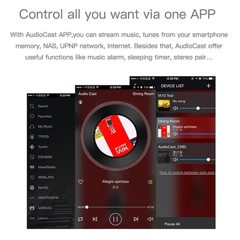 L'adaptateur prend en charge AirPlay, DLNA et UPnP, ce qui permet une diffusion en continu depuis les appareils iOS, Android, Windows et macOS. Il fonctionne avec les services de musique en ligne populaires tels que Spotify, TuneIn, Deezer, Pandora, iHeartRadio, ainsi qu'avec les serveurs NAS et la musique stockée localement.