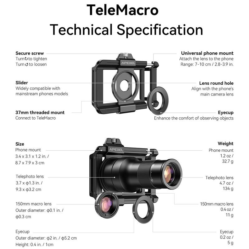 L'APL-TM6 d'Apexel est un kit d'objectifs 2-en-1 polyvalent conçu pour étendre les capacités photographiques de votre smartphone. Combinant un téléobjectif 6x et un objectif macro dédié de 150 mm, il vous permet de capturer des scènes lointaines et des gros plans complexes avec une clarté impressionnante. Que vous voyagiez, assistiez à des événements ou exploriez la nature, ce kit d'objectifs vous permet de vous rapprocher du sujet sans compromettre la qualité de l'image.