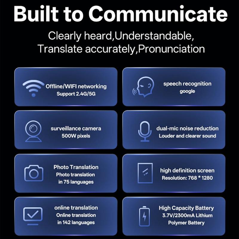 Brisez les barrières linguistiques partout avec le traducteur vocal intelligent T22, un puissant appareil portable conçu pour les voyageurs, les professionnels et les communicateurs du monde entier. Doté d'un grand écran HD de 5.5 pouces, d'une fonction de traduction assistée par ordinateur et d'une connexion Wi-Fi à double bande, il fournit des traductions rapides et précises dans 142 langues pour le texte, la voix et les photos.