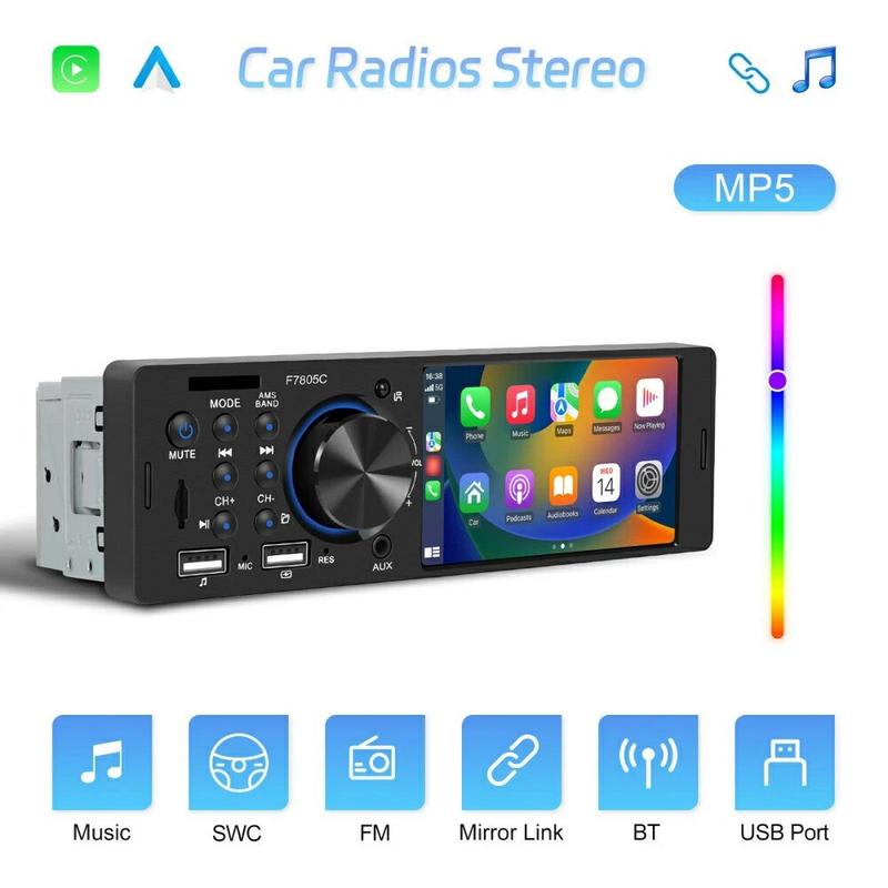 Transformez un tableau de bord vieillissant en un hub pour téléphone intelligent grâce à cet autoradio F7805C. L'écran capacitif de 10,4 cm prend en charge CarPlay câblé, Android Auto et Mirror Link, ce qui vous permet de suivre des cartes, de prendre des appels et de diffuser des listes de lecture sans avoir à manipuler votre téléphone. Le Bluetooth 5.1 assure des conversations claires, tandis qu'un rétroéclairage à 7 couleurs vous permet d'adapter l'éclairage à celui de l'usine. Conçu pour les systèmes 12 V et pesant moins de 0,4 kg, il se glisse dans la plupart des emplacements simple DIN avec un câblage minimal.