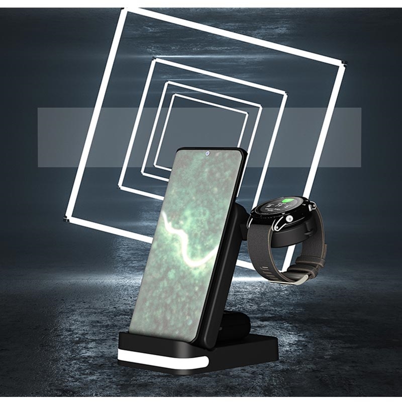 Simplifiez votre installation de chargement avec le chargeur sans fil 3-en-1 B-27. Chargez votre téléphone, votre Samsung Galaxy Watch (séries 3/4/5/6/7) et vos écouteurs en même temps, tout en profitant de l'ambiance d'une douce lumière nocturne pour un environnement apaisant et sans encombrement.