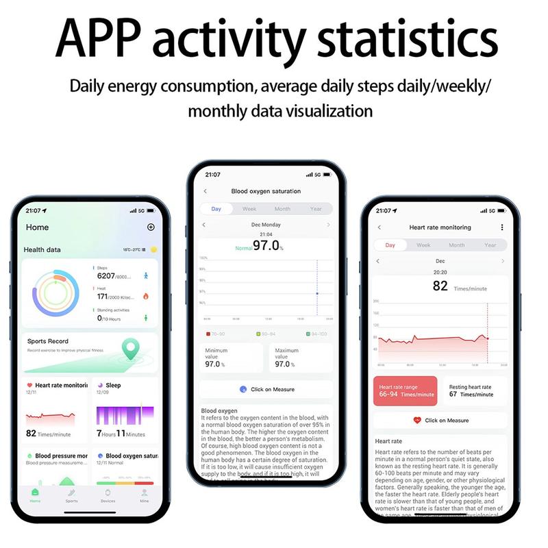 - Suivi complet de la santé - Surveillance de la fréquence cardiaque, de l'oxygène dans le sang (SpO2), de la pression artérielle et des habitudes de sommeil.