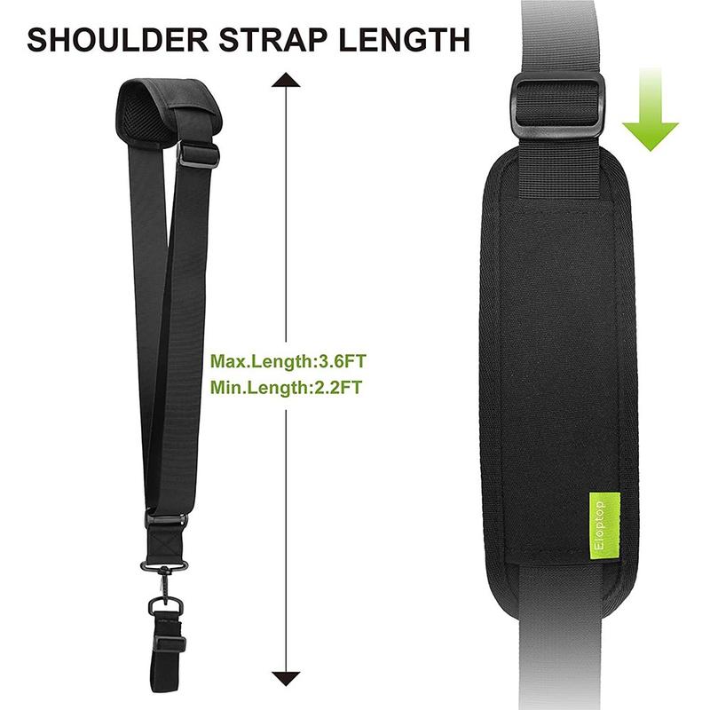 - Largeur confortable : la sangle de 3,8 cm répartit le poids pour réduire la tension sur l'épaule.