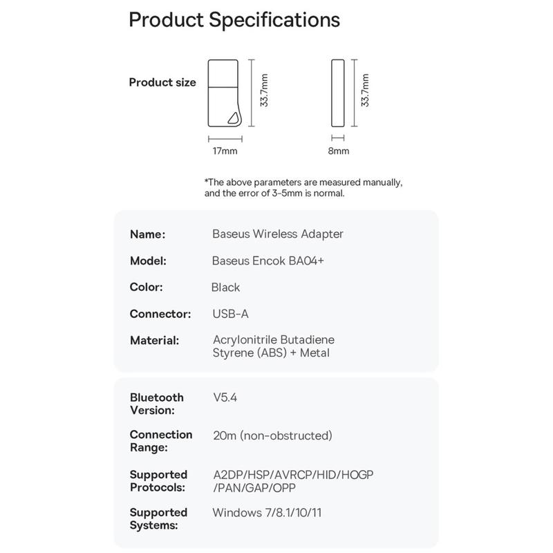 Baseus Encok BA04+ Adaptateur USB Bluetooth 5.4 longue portée - Dongle sans fil longue portée 20m