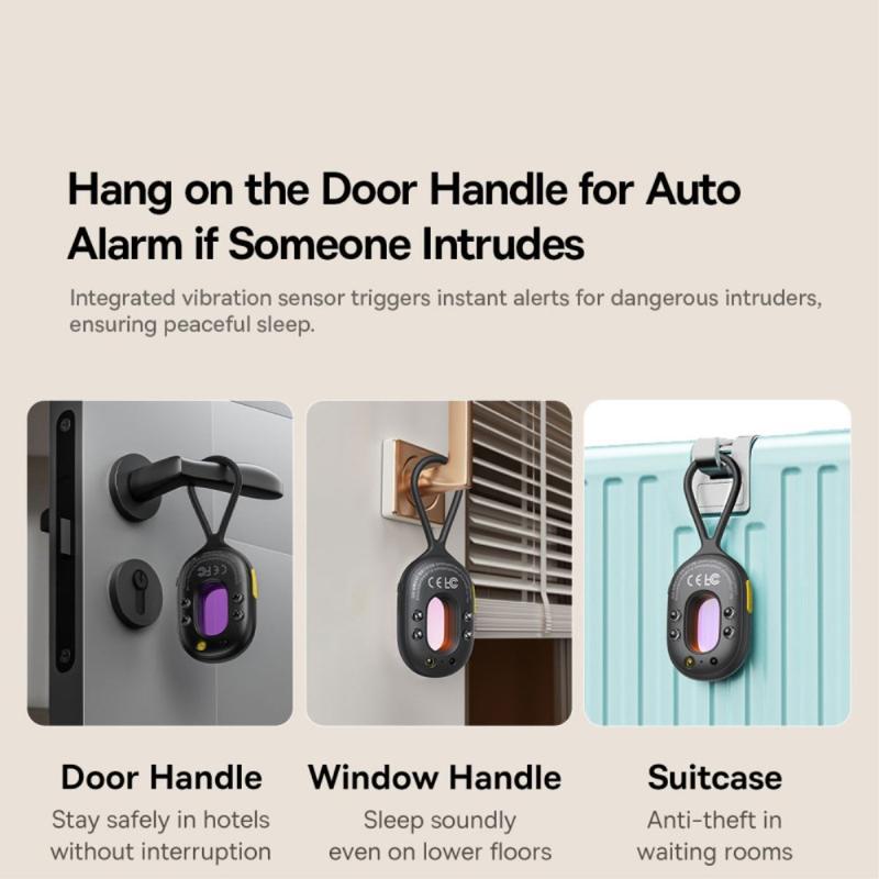- Sécurité nocturne : Accrochez-le à la poignée de votre porte pour déclencher une alarme si quelqu'un tente d'entrer à l'improviste.
