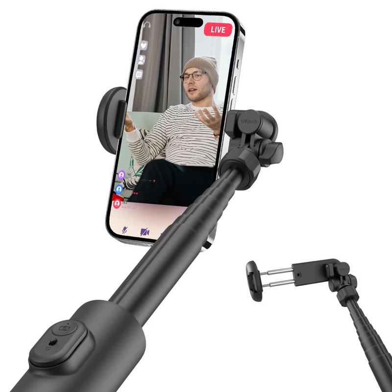 Réalisez des vlogs, des photos de groupe ou des diffusions en direct n'importe où grâce à ce bâton de selfie en aluminium ultra-polyvalent à 8 sections. Le T02 se plie plus petit qu'une bouteille d'eau mais s'étire jusqu'à 1,72 m, se transforme en trépied stable en quelques secondes et est livré avec une télécommande Bluetooth pour des prises de vue mains libres jusqu'à 10 m de distance.