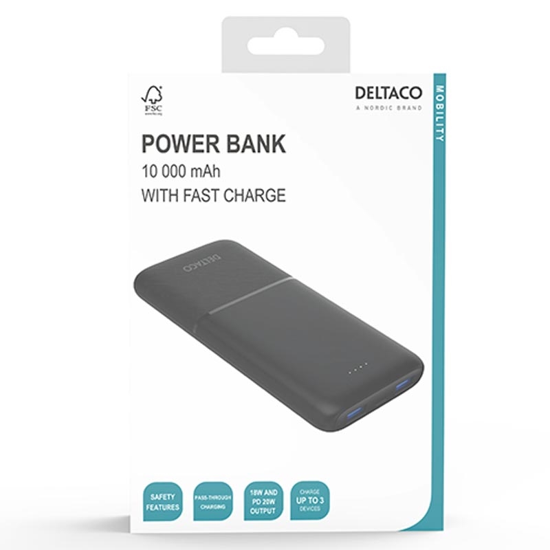 • Batterie externe Deltaco 10000mAh - Chargeur portable avec port USB-C PD 20 W et deux ports USB-A 18 W pour une recharge rapide