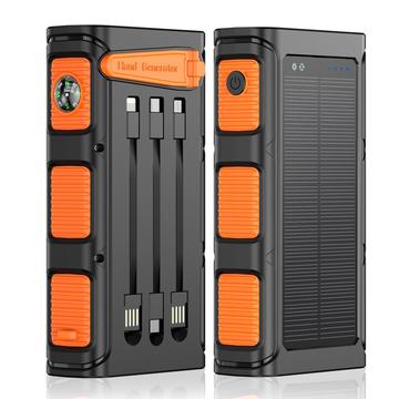 Batterie externe solaire 20000mAh avec manivelle, lampe torche LED et câbles intégrés - Orange / Noir