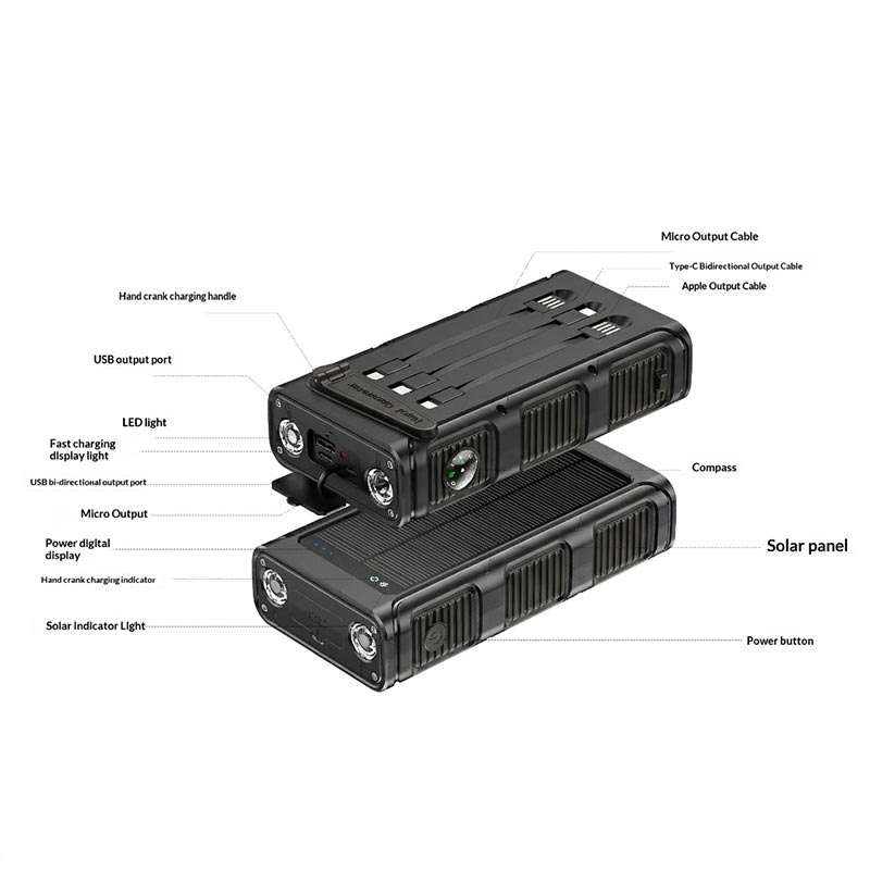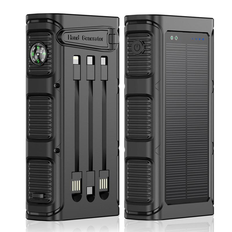 La batterie haute capacité de 30000mAh prend en charge de multiples cycles de recharge pour les téléphones, les petits gadgets et autres appareils du quotidien. Elle dispose également d'une recharge rapide PD 20 W, de deux ports de sortie et de câbles intégrés de type C, Micro-USB et Lightning, pour que vous puissiez recharger plus facilement sans avoir à transporter de câbles supplémentaires. Pour plus de praticité en extérieur, elle comprend une lampe torche LED puissante, une alarme SOS et une boussole.