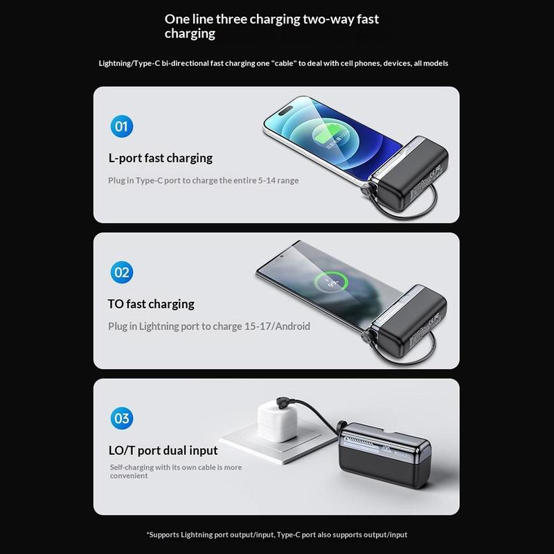 Les ports USB-C et USB-L prennent tous deux en charge la recharge bidirectionnelle, ce qui permet à la batterie externe de se recharger rapidement tout en offrant des options de recharge flexibles pour vos appareils. Elle peut prendre en charge la recharge de plusieurs appareils en fonction de vos besoins, ce qui la rend utile pour les personnes qui transportent plusieurs gadgets au cours de la journée. Cette flexibilité supplémentaire en fait un accessoire de recharge portable plus polyvalent.