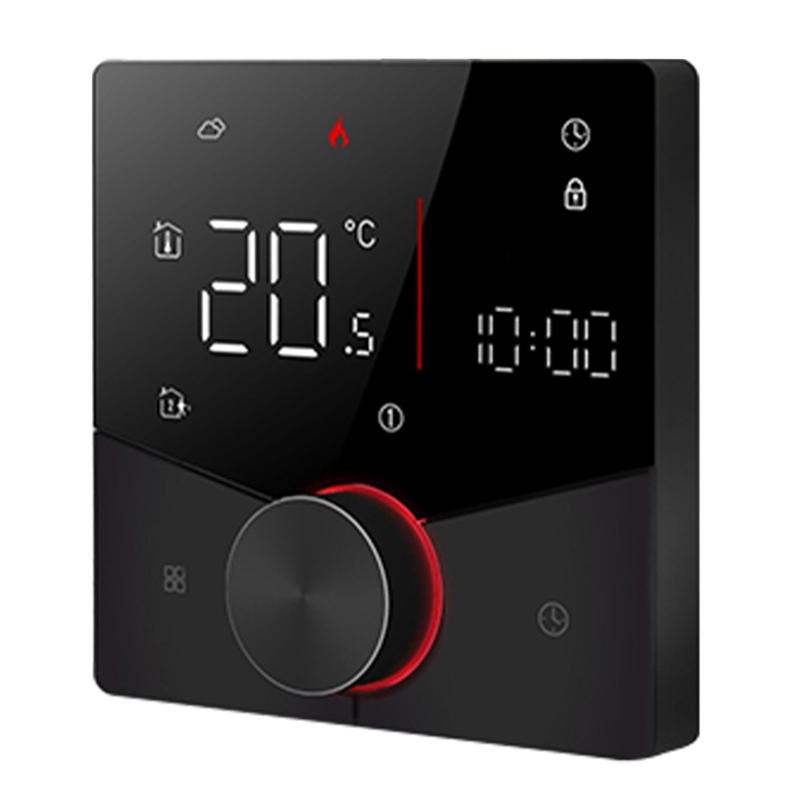 Ce thermostat est doté d'un élégant panneau encastré ultra-fin qui s'intègre parfaitement au mur pour une finition épurée et moderne. La façade sans cadre aux angles arrondis lui confère un aspect raffiné qui s'harmonise facilement avec différents styles d'intérieur. Son écran LED offre une lisibilité claire des relevés de température et des réglages, tandis que les boutons tactiles capacitifs permettent une utilisation fluide et précise d'un simple effleurement.