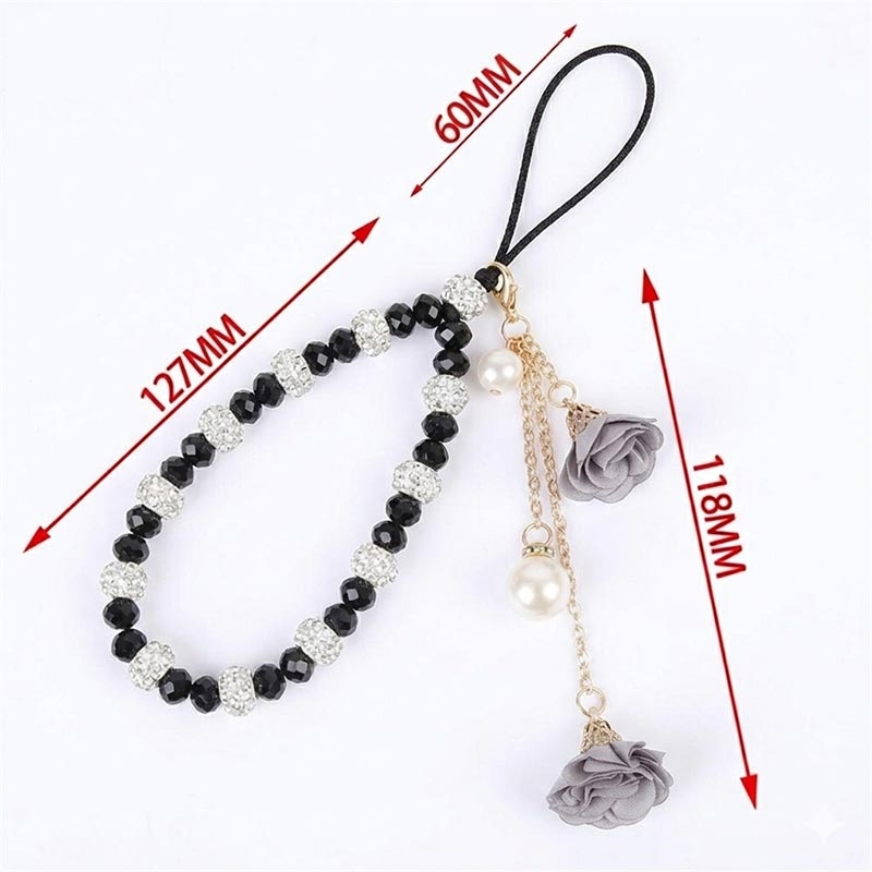 Lanière de téléphone en perles de cristal de 18,7 cm avec breloques en forme de rose - Accessoire pour téléphone portable avec dragonne et chaîne de poignet