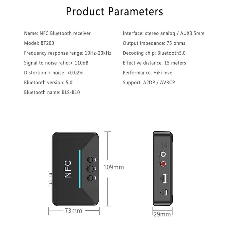BT200 Récepteur audio NFC Bluetooth 5.0 - Adaptateur AUX 3.5mm et RCA - Noir