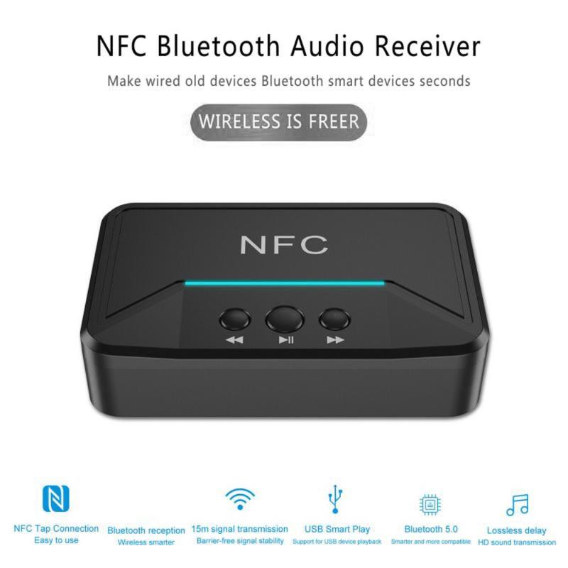 • BT200 Récepteur audio NFC Bluetooth 5.0 - Adaptateur AUX 3.5 mm & RCA avec A2DP, alimentation USB, Auto On/Off pour voiture et Home Stereo (portée 15 m)