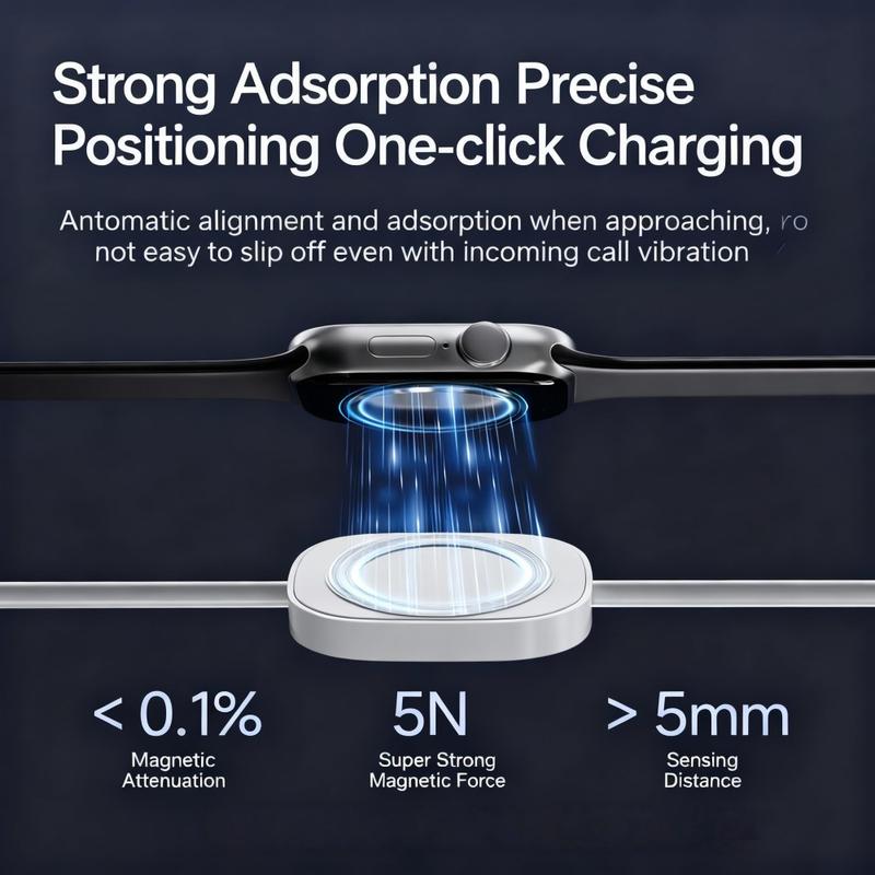 - Le socle magnétique de charge sans fil pour Apple Watch garantit un alignement sûr et une charge stable.