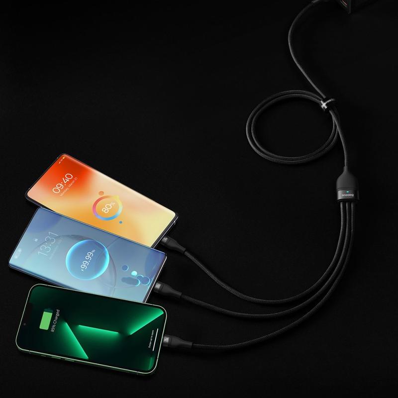 Chargez plus d'appareils avec moins de câbles grâce au câble de charge rapide 3 en 2 Baseus Flash Series. Ce câble multi-connecteurs intelligent dispose d'une double entrée (USB-A et USB-C) et de trois sorties (USB-C, Lightning et Micro USB) pour une large compatibilité avec les téléphones, tablettes, accessoires et bien plus encore. Les puces de reconnaissance intégrées permettent de répartir le courant et la tension en toute sécurité, tandis que les voyants LED indiquent l'état de la charge rapide en un coup d'œil. Sa gaine tressée en nylon durable et sa construction renforcée en font un câble fiable pour une utilisation quotidienne à la maison, au bureau, en voyage ou en voiture.