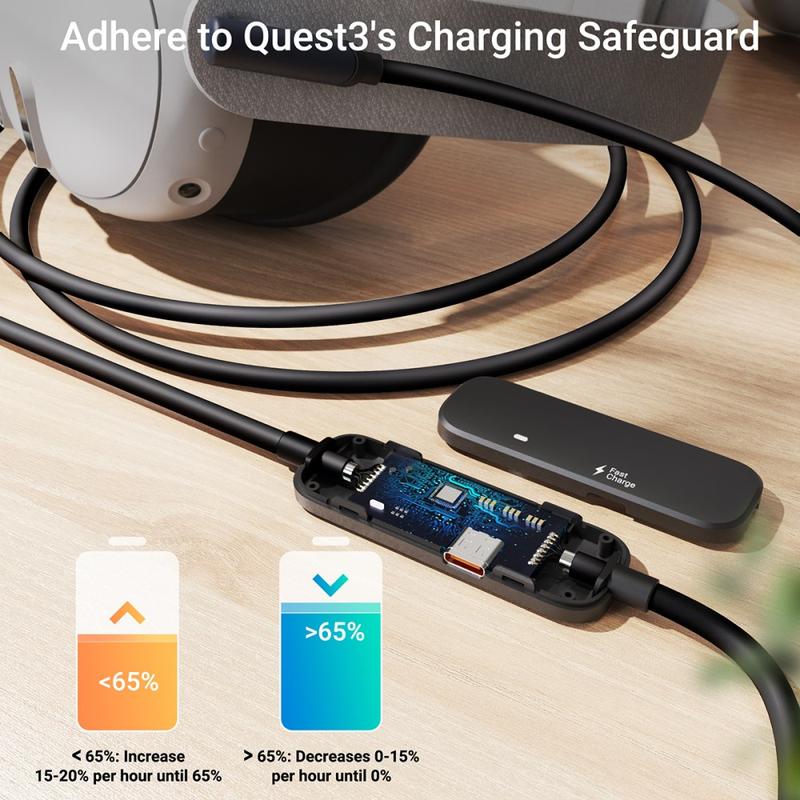 Si vous utilisez Quest pour PCVR, ce câble vous aide à résoudre deux problèmes courants à la fois : la consommation de la batterie et la stabilité de la connexion. Vous bénéficiez d'une connexion filaire USB 3.0 et d'un port de recharge dédié, ce qui vous permet de continuer à jouer pendant la recharge. La longueur de 5m convient à une utilisation active de la RV, et la puce de sécurité est conçue pour gérer la recharge de manière plus intelligente afin de mieux préserver la batterie à long terme.