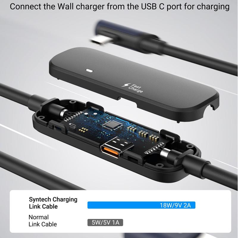 Jouez plus longtemps en réalité virtuelle sans vous soucier de l'épuisement de la batterie. Le Syntech M32C1-5 est un câble de liaison VR de 5m conçu pour Meta Quest 3S, Quest 3 et Quest 2, combinant des données USB 3.0 haut débit avec un port de chargement dédié de 18 W. Cela vous permet de maintenir une connexion filaire stable avec votre PC pour PCVR tout en rechargeant le casque, afin que vous puissiez rester dans le jeu pendant de longues sessions.