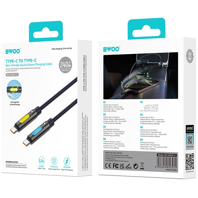 Câble de recharge aromathérapie BWOO USB-C vers USB-C 240 W 1,2 m - Lumière RVB, silicone liquide, 480 Mbps