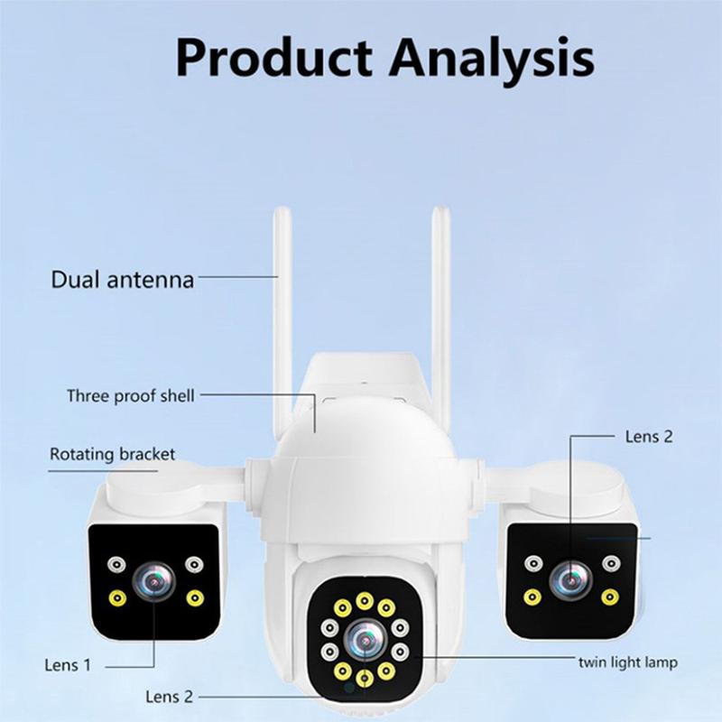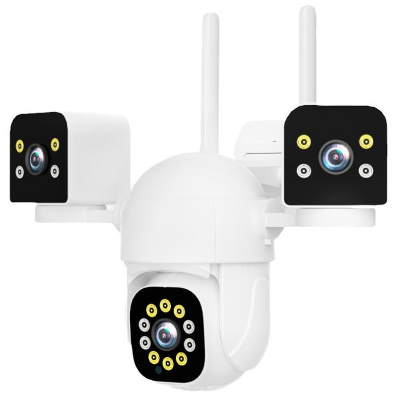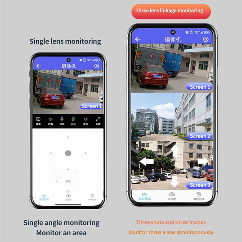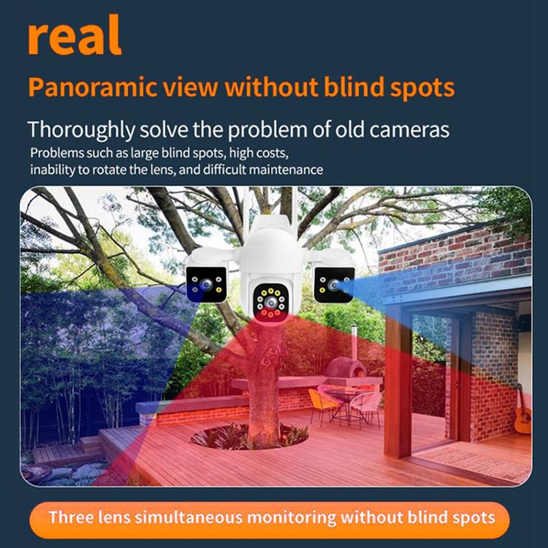 - Couverture 360° à trois objectifs - Trois objectifs (25 mm + 12 mm + 4 mm) fonctionnent ensemble pour une surveillance sans faille et sans angle mort, à l'intérieur comme à l'extérieur.