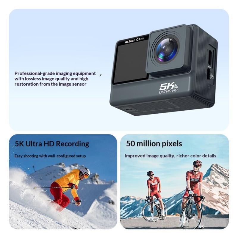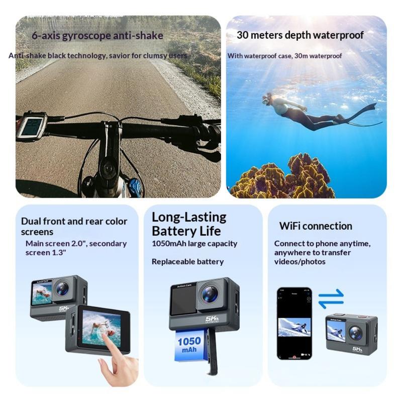Caméra d'action double écran F308AATR - Caméra sportive HD 5K avec stabilisation 6 axes, WiFi et boîtier étanche