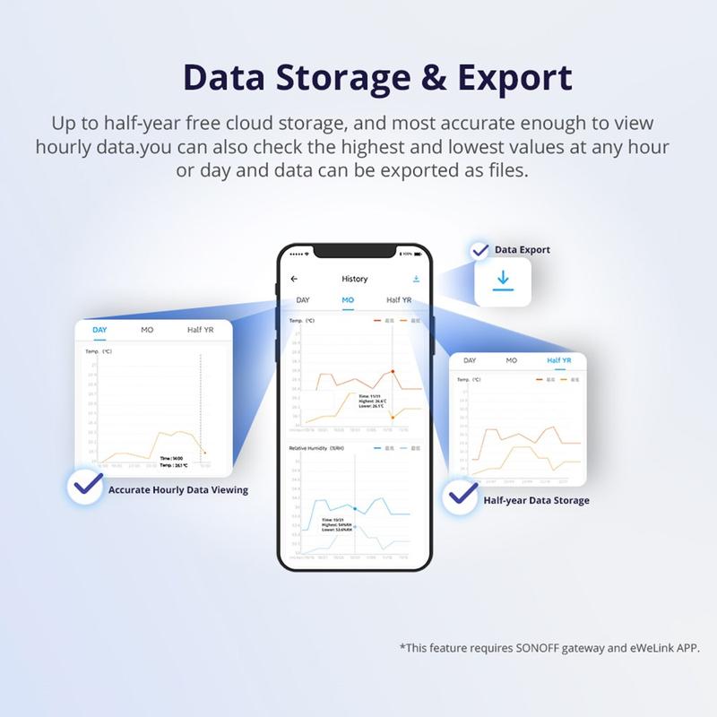 - Stockage gratuit des données dans le cloud jusqu'à 6 mois + affichage des tendances horaires, des maximums/minimums et exportation des données