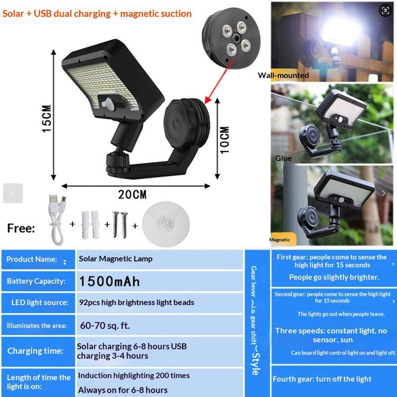 Éclairez vos espaces extérieurs plus efficacement grâce à l'applique magnétique à détecteur de mouvement CCP0144 équipée de 92 LED. Conçue pour les jardins, les terrasses, les allées, les entrées de garage, les clôtures, les entrées et autres espaces extérieurs, cette lampe solaire allie une détection de mouvement intelligente, une installation flexible et une construction résistante aux intempéries en une seule solution d'éclairage pratique. Son ensemble de 92 LED offre un éclairage puissant lorsque vous en avez le plus besoin, contribuant ainsi à améliorer à la fois la visibilité et la sécurité extérieure.