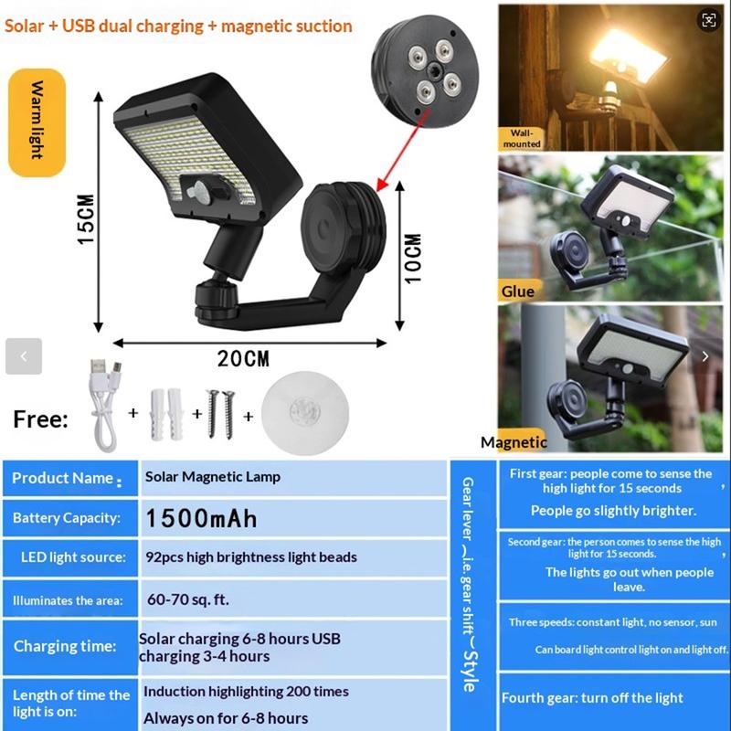 Éclairez vos espaces extérieurs plus efficacement grâce à l'applique magnétique à détecteur de mouvement CCP0144 équipée de 92 LED. Conçue pour les jardins, les terrasses, les allées, les entrées de garage, les clôtures, les entrées et autres espaces extérieurs, cette lampe solaire allie une détection de mouvement intelligente, une installation flexible et une construction résistante aux intempéries en une seule solution d'éclairage pratique. Son ensemble de 92 LED offre un éclairage puissant lorsque vous en avez le plus besoin, contribuant ainsi à améliorer à la fois la visibilité et la sécurité extérieure.