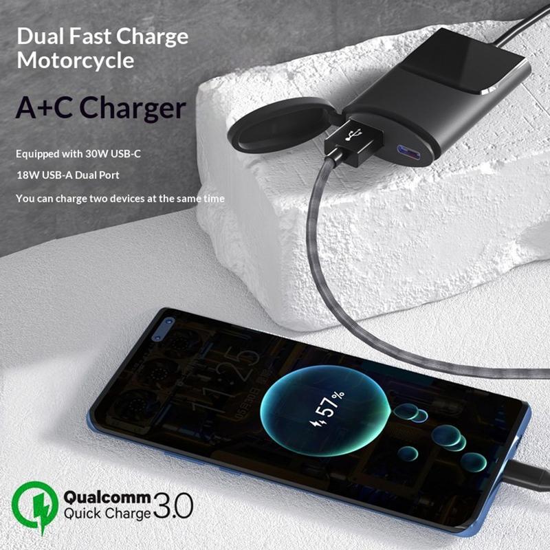 Doté d'un port USB-C PD de 30W et d'un port USB-A de 18W, ce chargeur prend en charge la recharge rapide d'une large gamme d'appareils et vous permet de recharger deux appareils en même temps. Sa conception étanche IP67 et ses protections de sécurité intégrées en font un choix fiable pour la conduite quotidienne et l'utilisation en extérieur dans des conditions météorologiques changeantes.