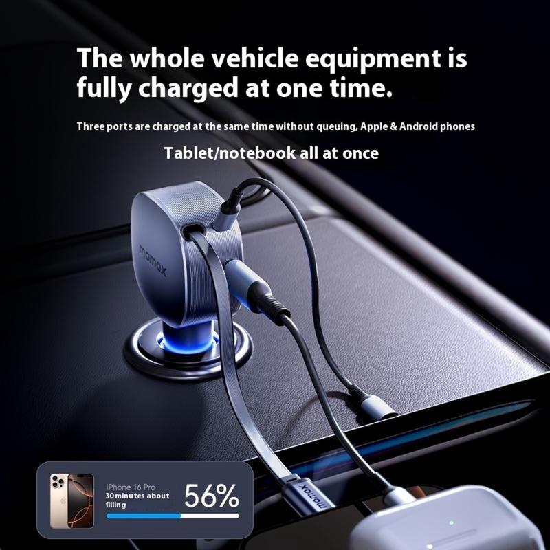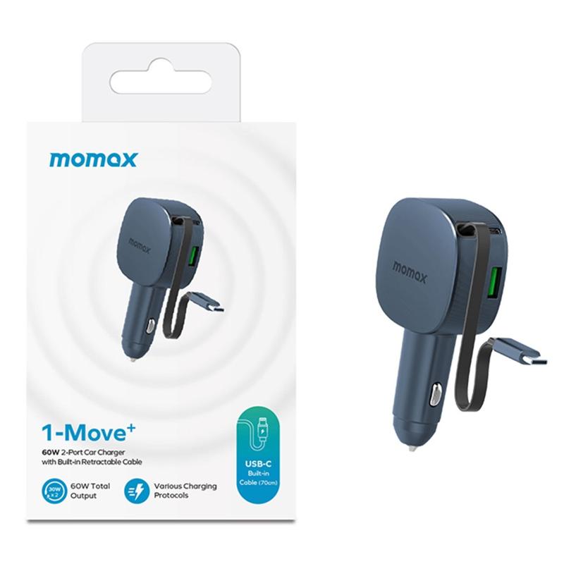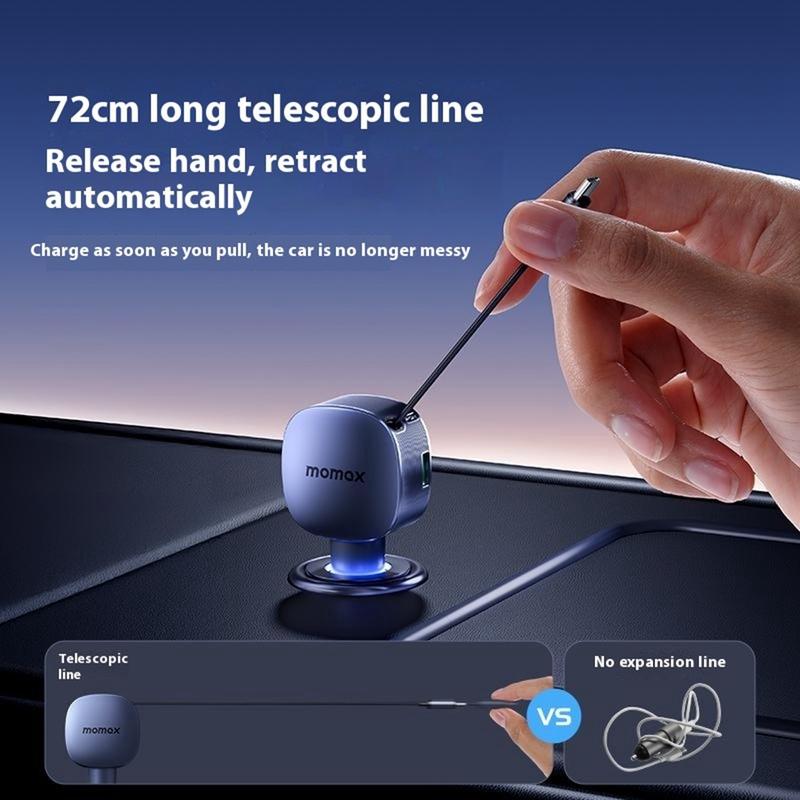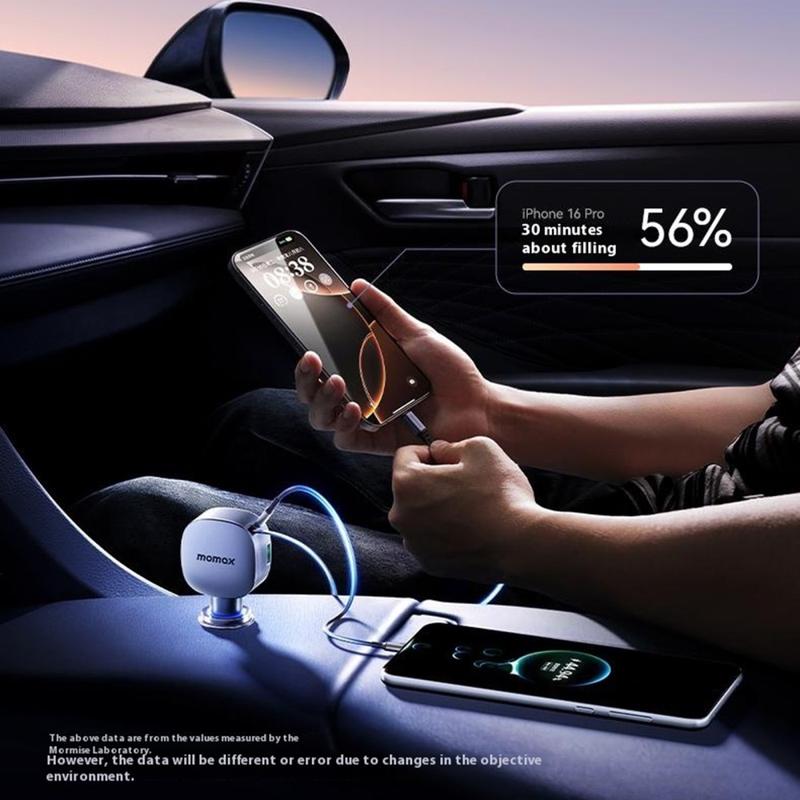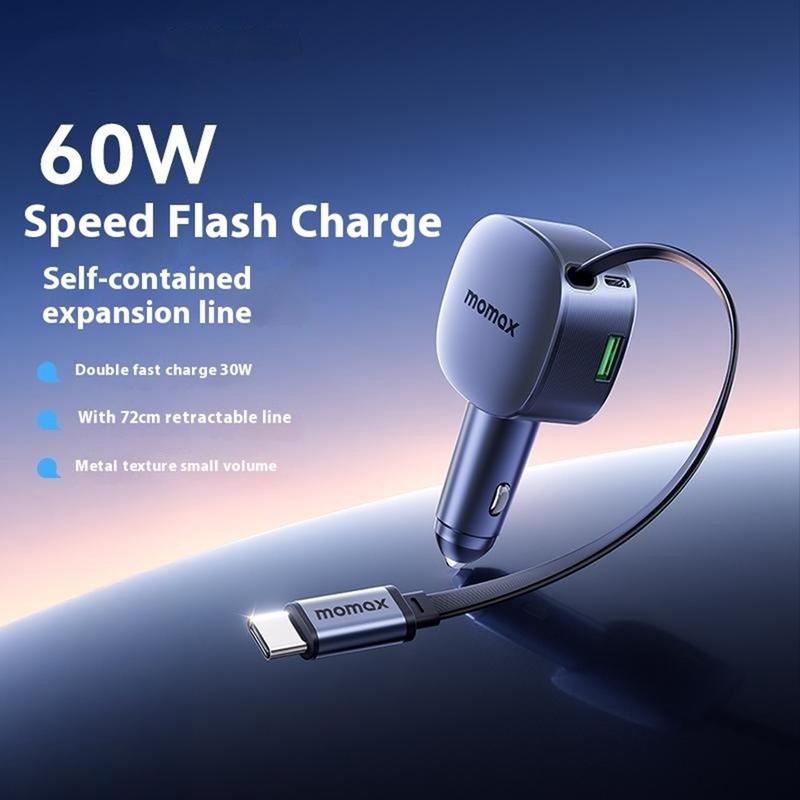 Chargeur de voiture Momax 60W - Câble USB-C 30 W rétractable + port USB-C 30 W + adaptateur de charge rapide USB-A 24 W
