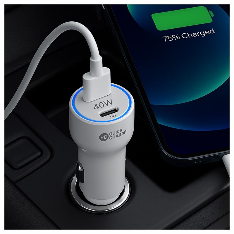 Chargeur de voiture rapide USB-C PD 40W avec anneau lumineux LED - Blanc