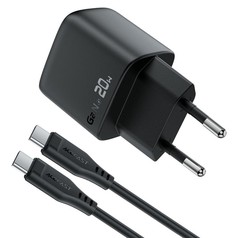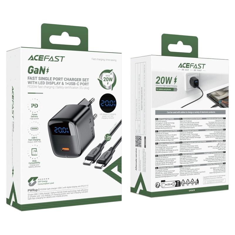 Chargeur GaN 20W Acefast A113 avec câble USB-C et affichage de la puissance par LED