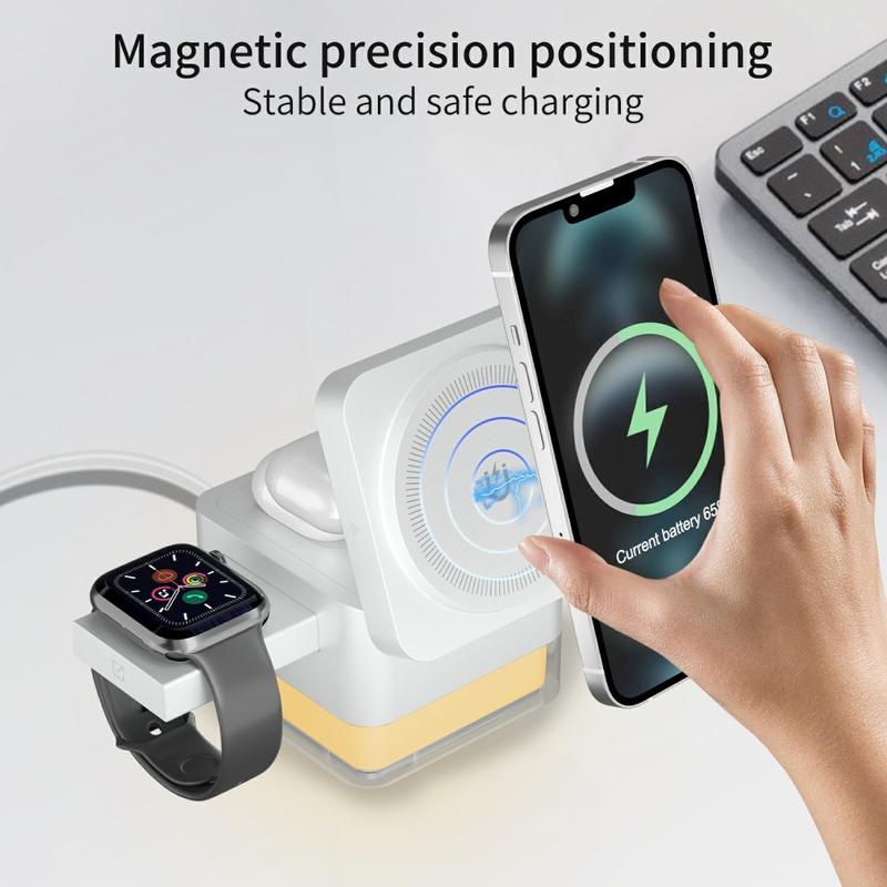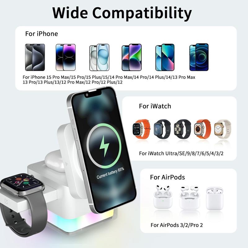 L'alignement magnétique aide à maintenir les appareils compatibles dans la bonne position pour une recharge stable, tandis que la conception pliable permet de ranger facilement la station dans un sac ou un sac à dos. Elle dispose également d'un éclairage d'ambiance RVB qui ajoute une douce lueur décorative et peut servir de veilleuse sur un bureau ou une table de chevet.