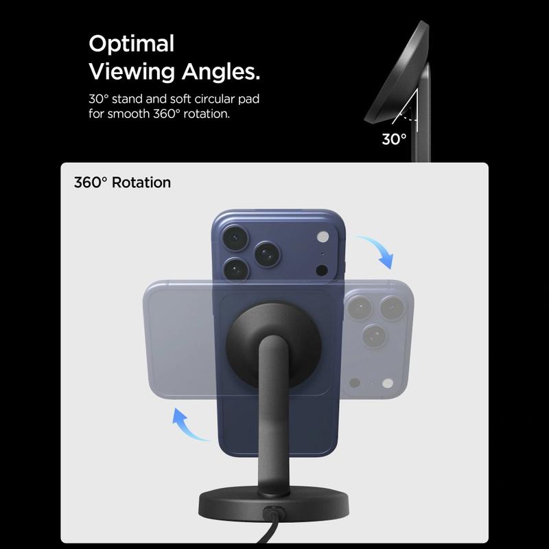 Le Spigen EF151MS combine un alignement magnétique puissant, un angle de vision confortable et une recharge sans fil stable dans un appareil compact. Il vous permet de recharger et d'utiliser votre téléphone simultanément sans le tenir, ce qui le rend pratique pour le travail et la détente. Avec ses protections de sécurité intégrées et son câble USB-C durable inclus, il offre une recharge fiable dans un design épuré et moderne.