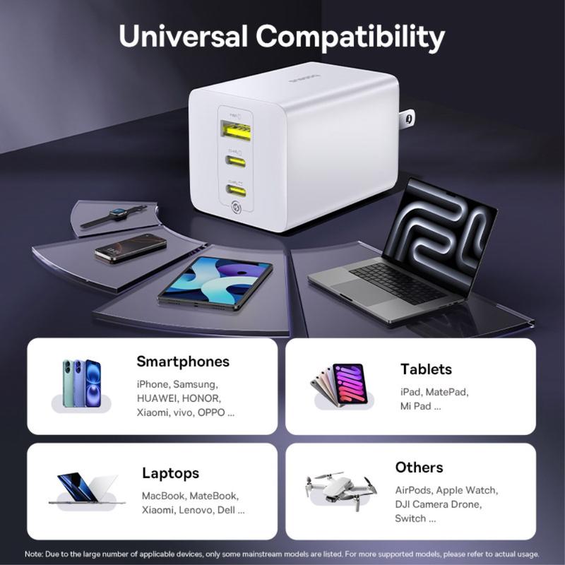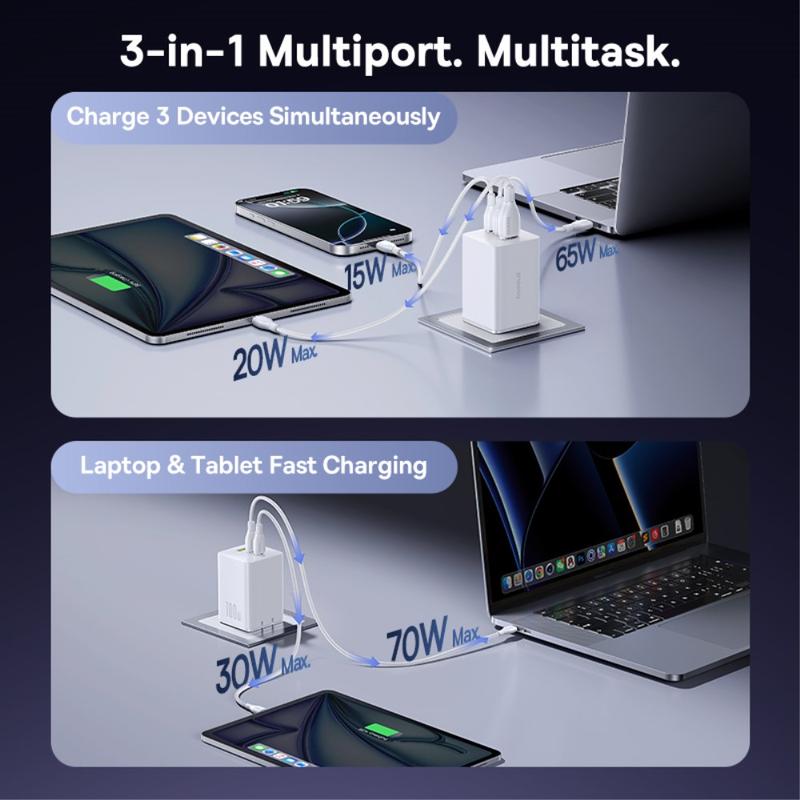 - Distribution intelligente de la puissance : 70 W + 30 W sur le double port USB-C, ou 65 W + 20 W + 15 W sur les trois ports