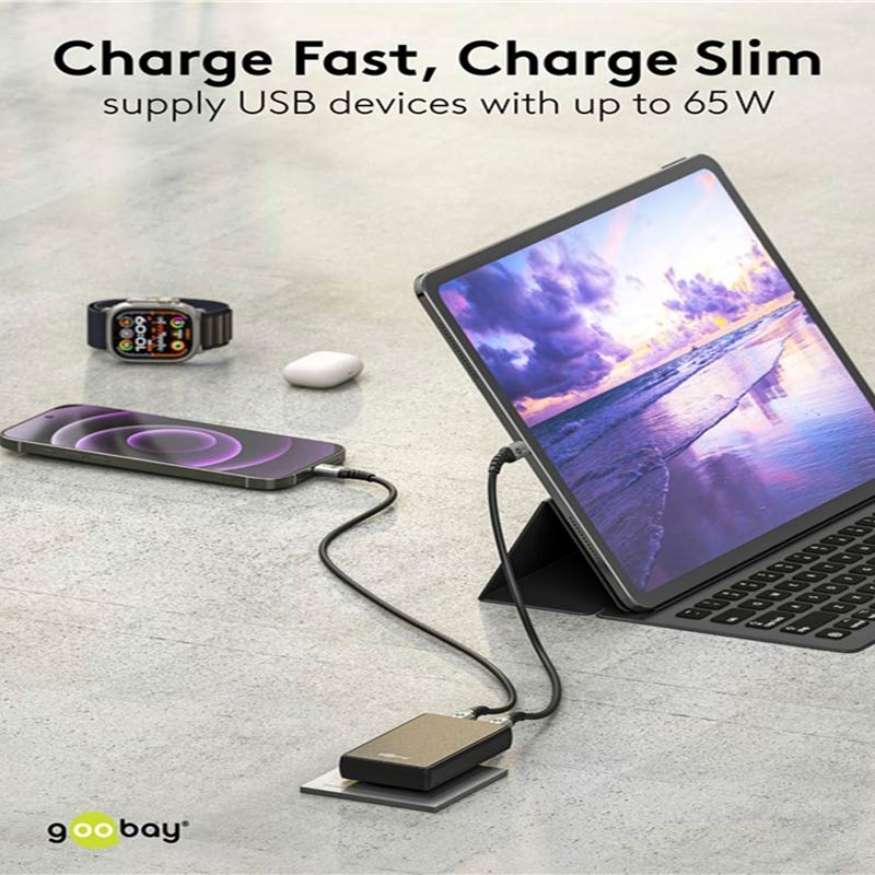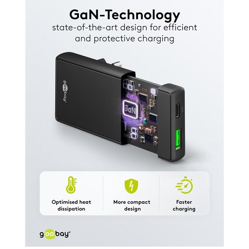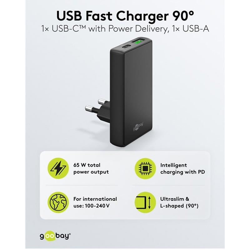 Chargeur rapide double Goobay GaN à angle droit plat de 90° - 65W, USB-C & USB-A - Noir