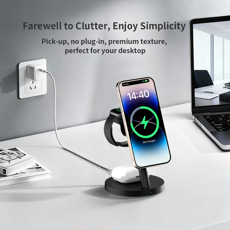 Les chargeurs sans fil 3-en-1 sont populaires car ils réduisent l'encombrement des câbles et rendent la recharge quotidienne plus pratique. Les supports de recharge magnétiques sont particulièrement utiles car ils aident à positionner le téléphone correctement plus facilement qu'un socle de recharge plat. Les modèles avec supports réglables facilitent également la consultation des notifications, l'utilisation du mode veille ou le maintien de l'écran visible pendant la recharge.