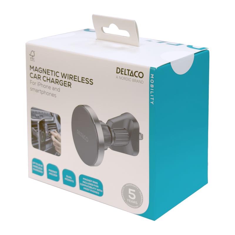Chargeur de voiture sans fil magnétique amovible Deltaco - Support pour téléphone Qi2 15W avec fixation pour grille d'aération et ventouse