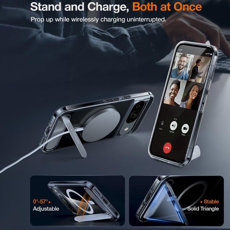 Vous bénéficiez de trois avantages essentiels (chargement magnétique sécurisé, support réglable intégré et protection contre les chutes) dans un seul étui élégant. Pas d'accessoires supplémentaires à emballer ou à échanger ; il suffit de déployer le support lorsque vous en avez besoin et de le replier lorsque ce n'est pas le cas.