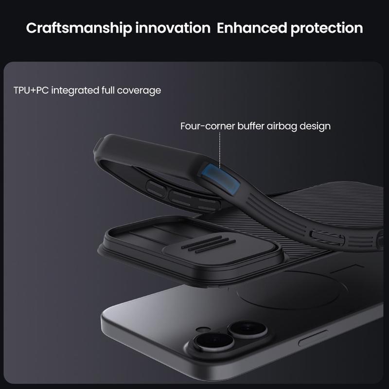 Profitez d'une intimité et d'une protection supplémentaires avec la coque hybride Nillkin CamShield Pro. Combinant du plastique rigide et du TPU, le cache de l'appareil photo évite les rayures tout en protégeant votre iPhone 17 de l'usure quotidienne.