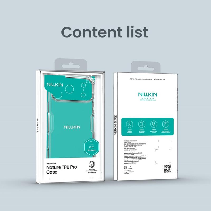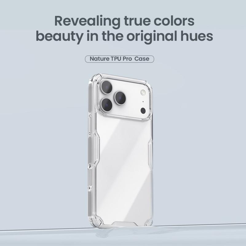 La coque hybride Nillkin Nature TPU Pro protège votre iPhone 17 Pro Max contre les rayures et les dommages quotidiens, et avec sa conception antidérapante, elle maintient l'appareil en sécurité dans vos mains pendant l'utilisation. De plus, la transparence de la coque hybride Nillkin Nature TPU Pro permet à votre iPhone 17 Pro Max de briller par son apparence physique.