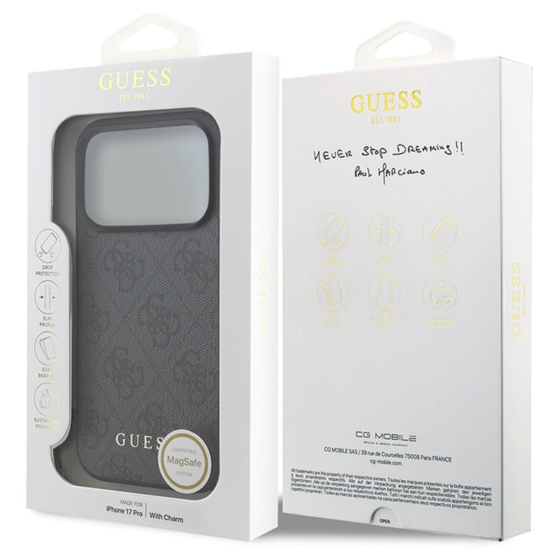 La coque iPhone 17 Pro Guess 4G est plus qu'une simple protection, c'est un véritable atout mode. Le motif raffiné du logo 4G, l'emblème Guess doré et la breloque attachée ajoutent une touche de glamour et permettent à votre téléphone de se démarquer dans toutes les situations.