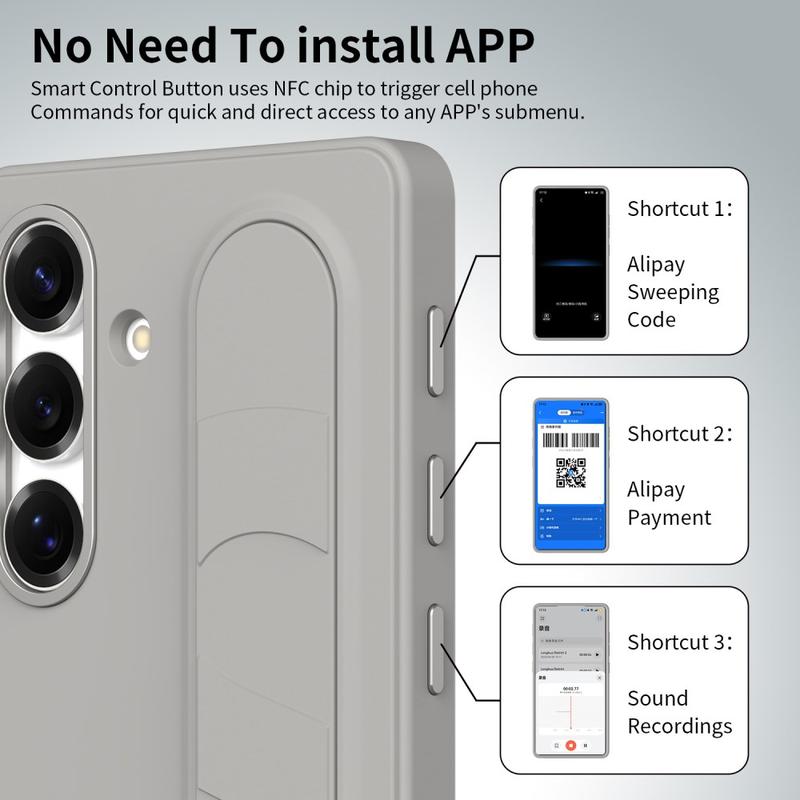 Équipé de trois boutons NFC intelligents, cet étui hybride intelligent vous permet d'accéder rapidement à des applications telles que Appareil photo, Lampe de poche ou Capture d'écran d'une simple pression. Pas de charge, pas d'applications supplémentaires - juste une fonctionnalité simple et instantanée.