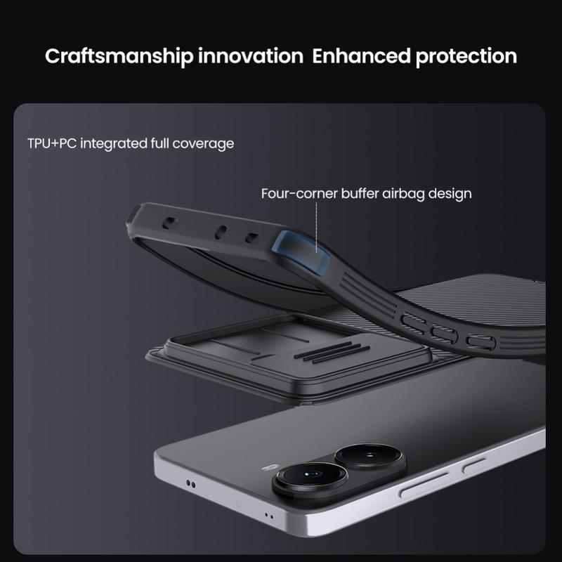 - Cet extraordinaire boîtier hybride Nillkin CamShield Prop est composé de matériaux plastiques et TPU