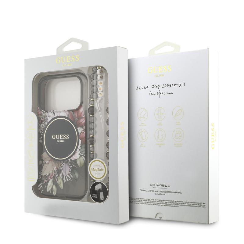 Coque avec bracelet en perles Guess IML Flowers pour iPhone 17 Pro - Étui protecteur élégant compatible MagSafe avec bracelet en perles