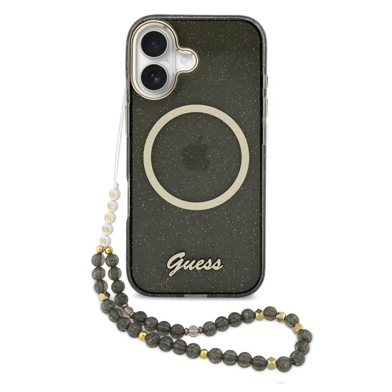Coque MagSafe avec dragonne Guess IML Glitter Script pour iPhone 17 - Coque arrière pailletée avec dragonne, protection PC+TPU, compatible MagSafe